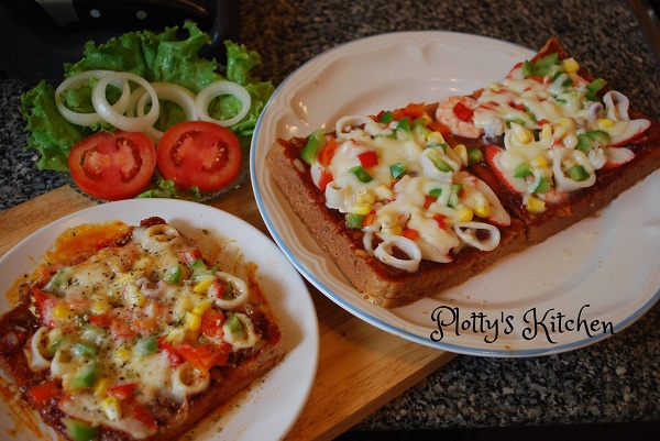 เมนูพิซซ่าขนมปังโฮลวีต เหมาะสั่งคู่กับกาแฟยามเช้า สูตรนี้ใส่ปลาหมึกกับกุ้ง เติมปูอัด เม็ดข้าวโพด และพริกฝรั่ง ก่อนนำไปอบโรยชีสยืดๆ