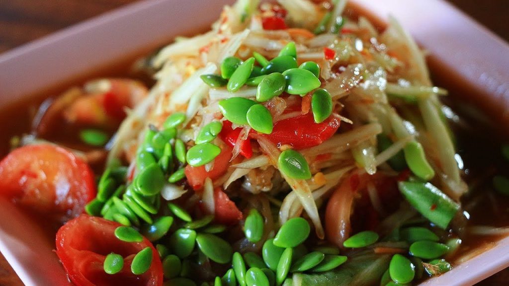 ยังไม่มีหลักฐานที่แน่ชัดว่ามีการนำมะละกอดิบมาปรุงเป็นส้มตำเป็นครั้งแรกเมื่อใด อย่างไรก็ตามเมื่อพิจารณาถึงที่มาของส่วนประกอบต่าง ๆ ของส้มตำ อาจได้ข้อมูลเบื้องต้นเพื่อประกอบการสันนิษฐานถึงที่มาของส้มตำได้ มะละกอเป็นพืชที่มีถิ่นกำเนิดในอเมริกากลาง ชาวสเปนและโปรตุเกสนำมาปลูกในเอเชียตะวันออกเฉียงใต้ในยุคต้นกรุงศรีอยุธยา ในขณะที่ชาวฮอลันดาอาจนำพริกเข้ามาเผยแพร่ในเวลาต่อมา ในรัชกาลสมเด็จพระนารายณ์มหาราช มีทูตชาวฝรั่งเศสผู้มาเยือนกรุงศรีอยุธยา คือ นีกอลา แฌร์แวซ (Nicolas Gervaise) และซีมง เดอ ลา ลูแบร์ พรรณนาว่าในเวลานั้นมะละกอได้กลายเป็นพืชพื้นเมืองชนิดหนึ่งของสยามไปแล้ว[1] และได้กล่าวถึงกระเทียม มะนาว มะม่วง กุ้งแห้ง ปลาร้า ปลากรอบ กล้วย น้ำตาล แตงกวา พริกไทย ถั่วชนิดต่าง ๆ ที่ล้วนสามารถใช้เป็นส่วนประกอบสำหรับปรุงส้มตำได้ ขณะเดียวกันได้เขียนว่า ในขณะนั้นสยามไม่มีกะหล่ำปลี และชาวสยามนิยมบริโภคข้าวสวย แต่ไม่มีการกล่าวถึงมะเขือเทศและพริกสด